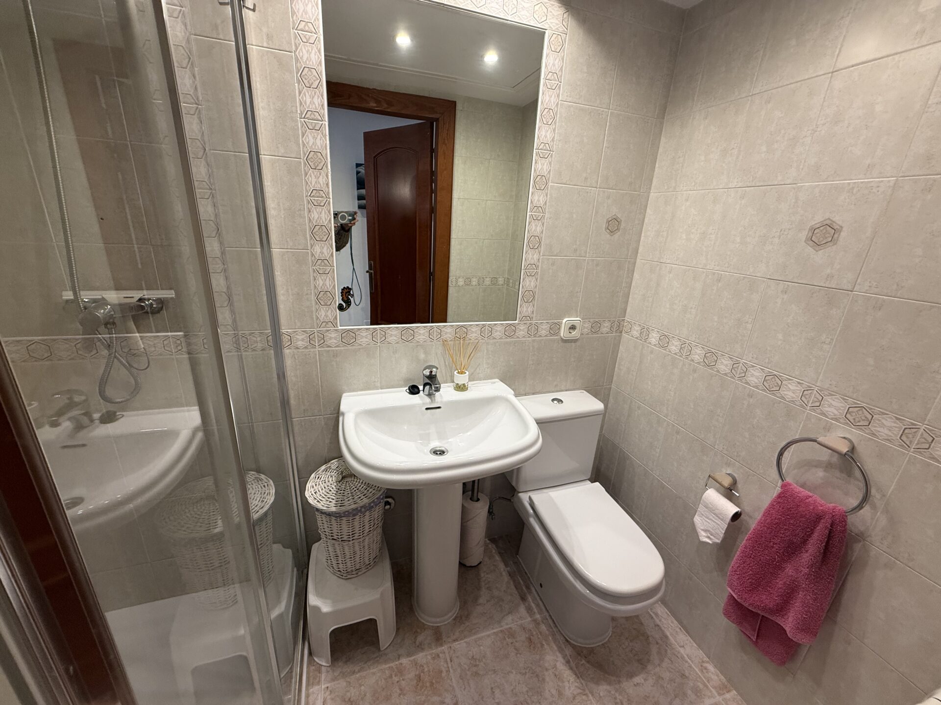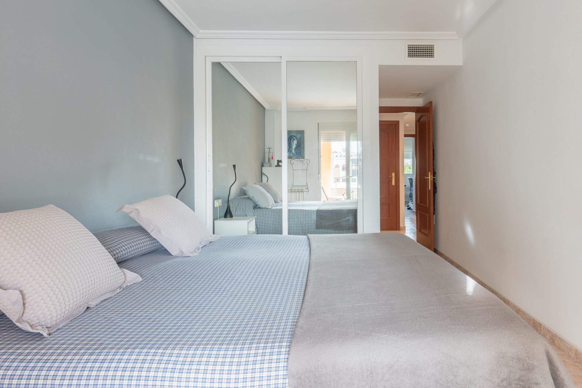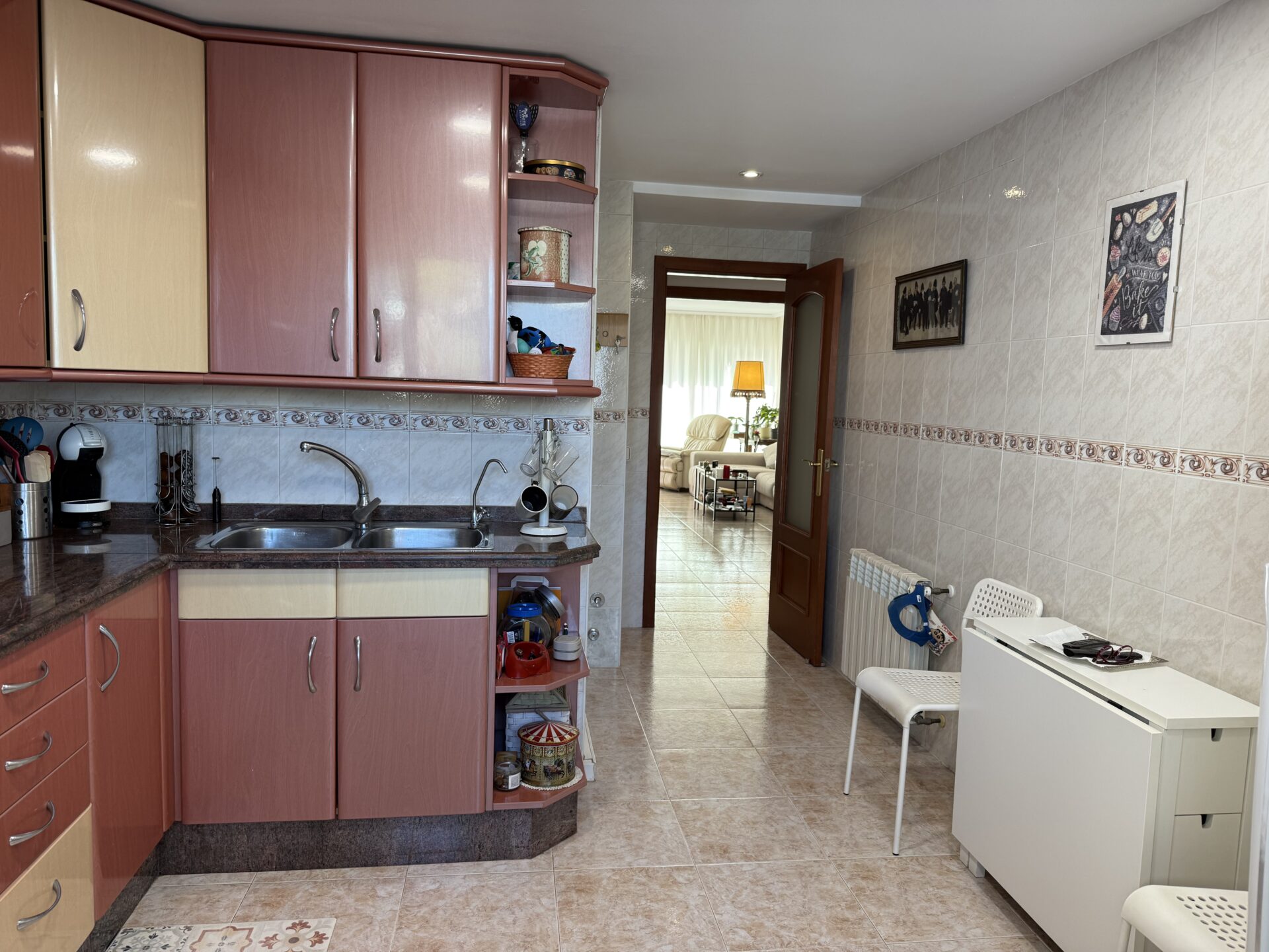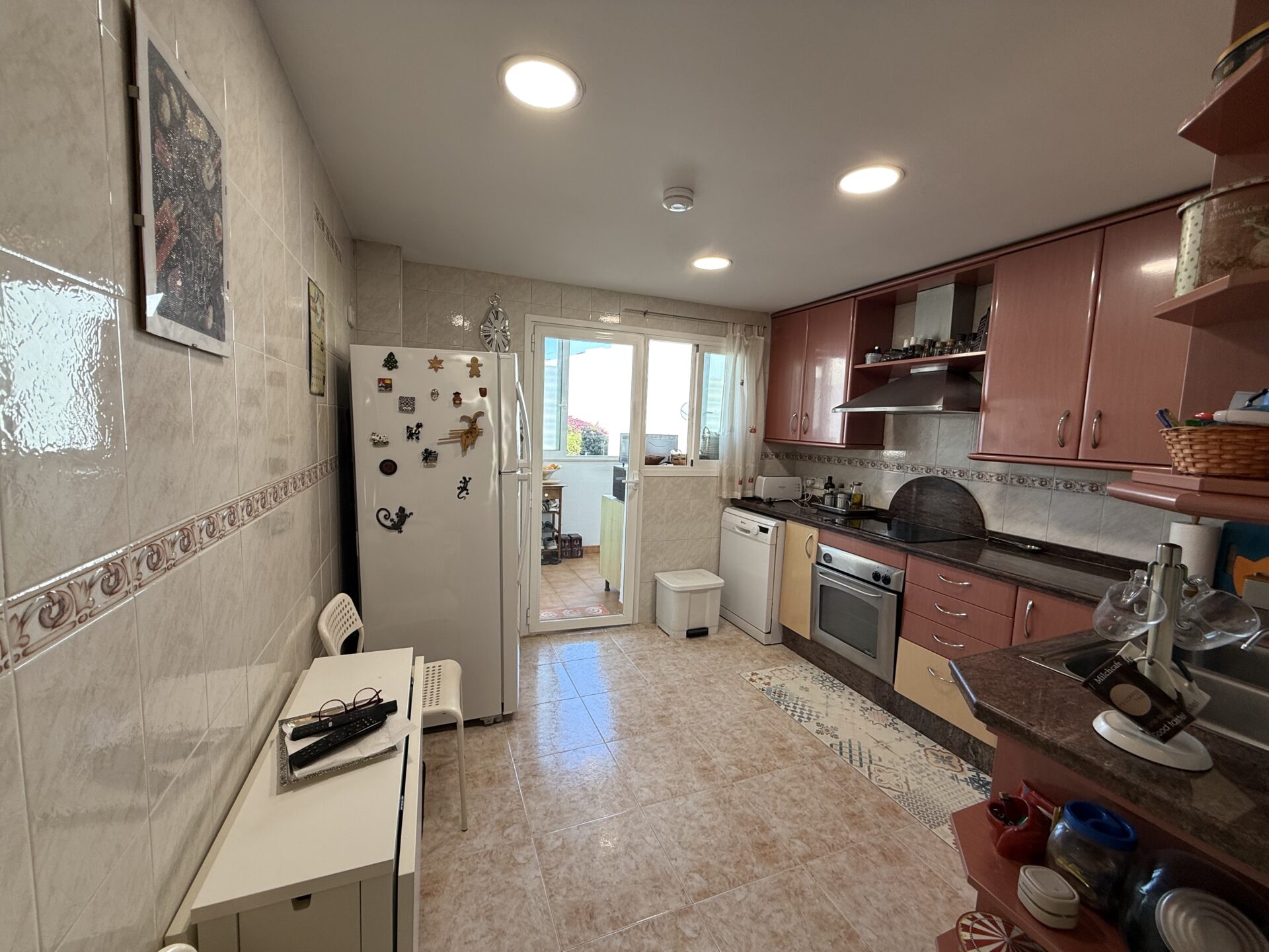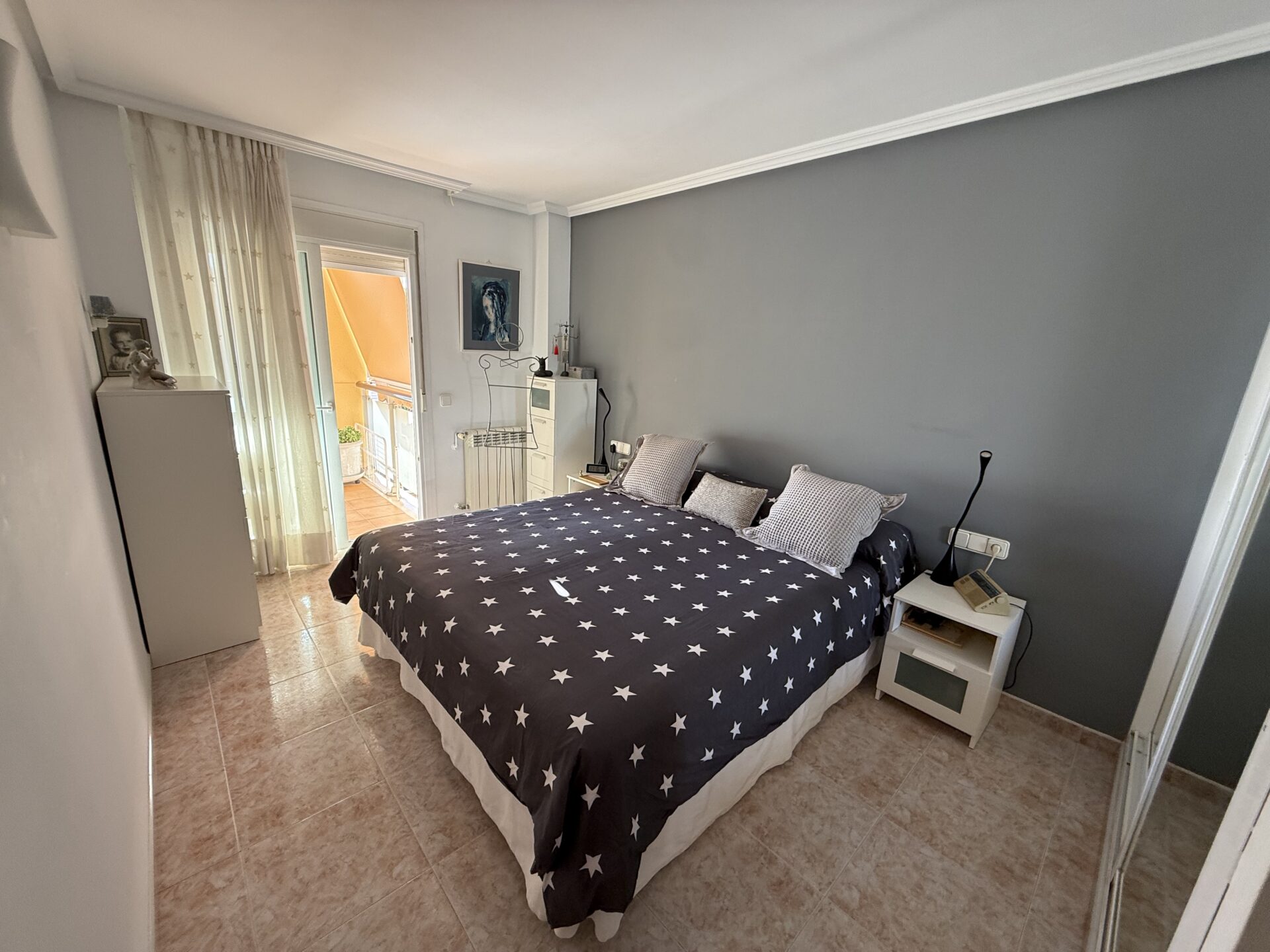 The interior features a generous and well-organised layout, including a spacious living-dining area and a fully equipped kitchen with a 12 m² utility space. The property offers three double bedrooms and two full bathrooms, along with a welcoming entrance hall with built-in wardrobe that enhances daily comfort. The sunny balcony, accessed from the living area, extends the indoor space and allows for year-round enjoyment of the Mediterranean climate.