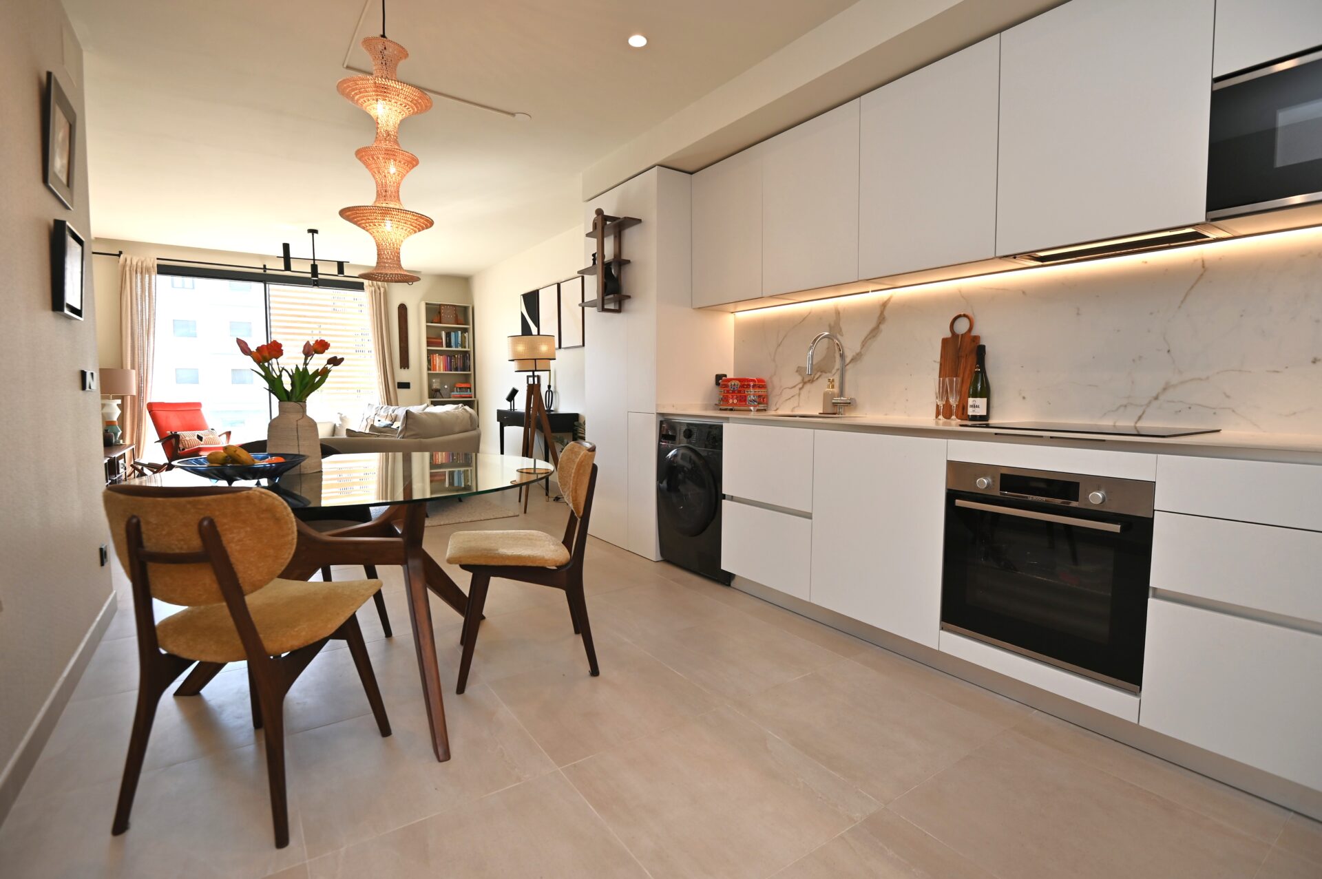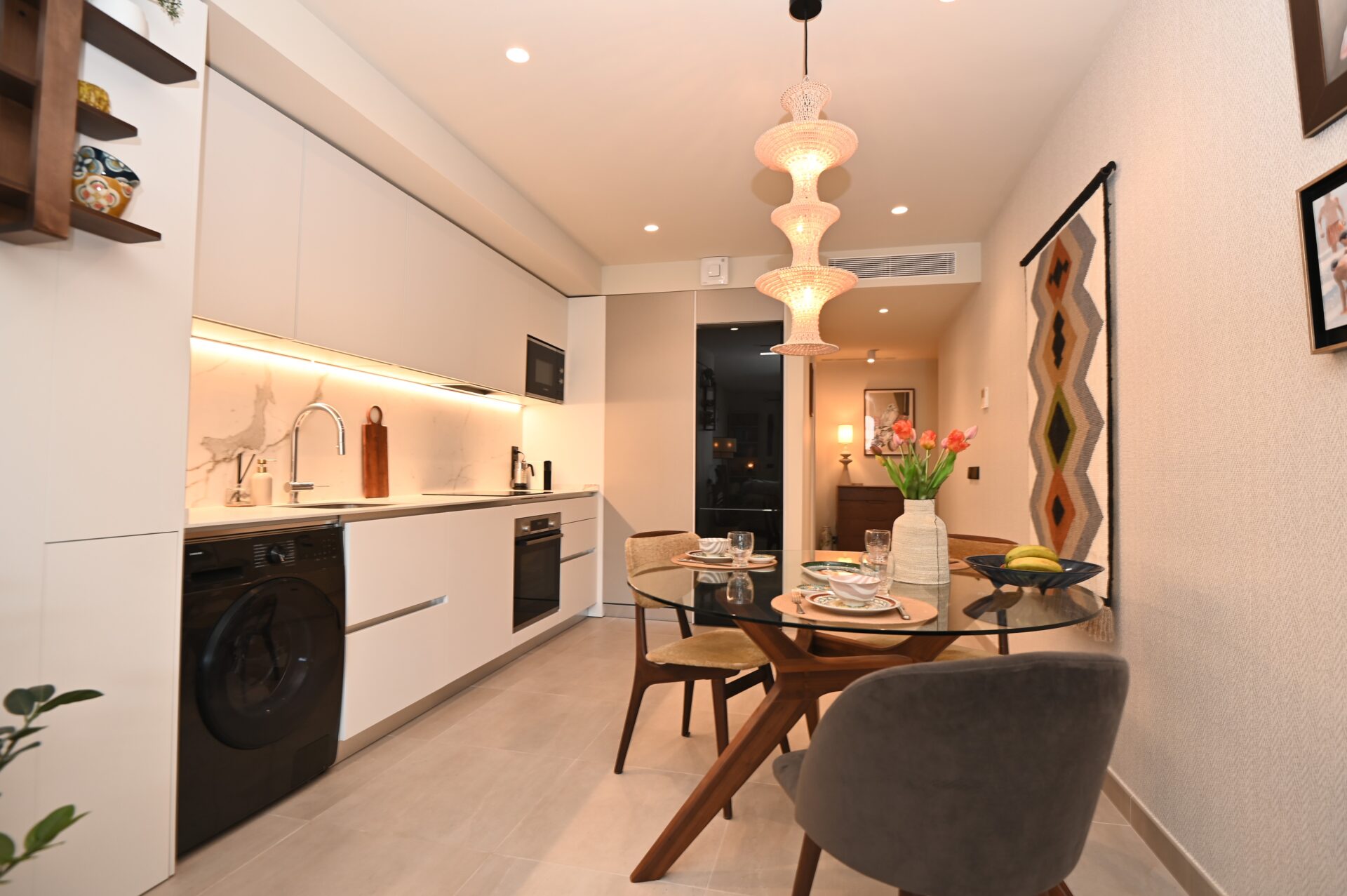 The property offers a built area of 89.2 m², plus a 2.30 m² storage room, and features a contemporary layout designed to make the most of natural light. It includes two spacious bedrooms and two bathrooms, one of them en suite, all finished to a high standard. The fully equipped kitchen is integrated into the open-plan living area, creating a bright and functional space that connects directly with the balcony and gives the apartment an appealing sense of continuity with the outside.